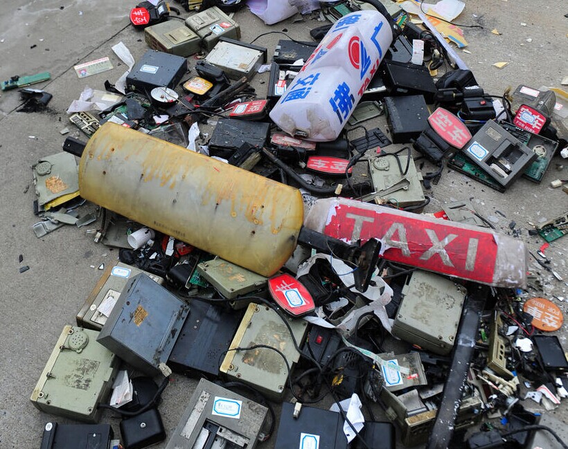 当日,在张槎一路的交警支队高速大队车辆保管场,35台假出租车整齐地排在一起,在旁边,还有一堆计价器、车灯。从外观上看,这些假出租车与真车并无两样,甚至连车身上的电召电话,都是今年7月佛山最新推出的统一电召。图为查获的假出租车设备。