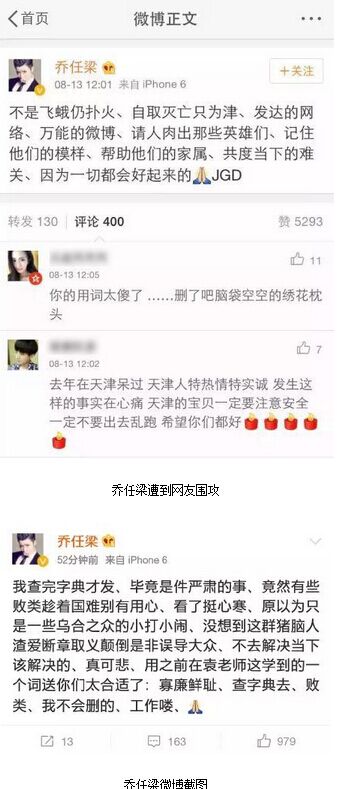 今天中午,演员乔任梁发微博为天津祈福,呼吁帮助搜出消防员的家属共渡难关,用到“人肉”“自取灭亡”等词,语言混乱,遭到网友疯狂吐槽。